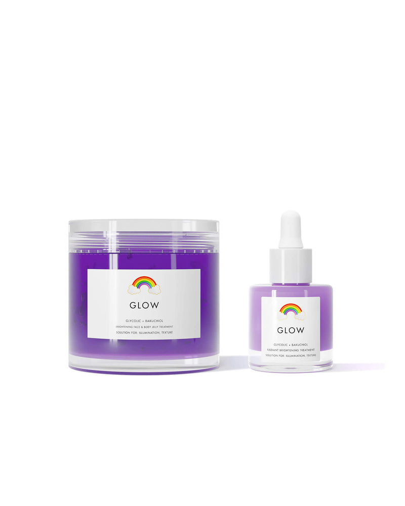 Glow Bundle harnesses the resurfacing powers of glycolic acid and bakuchiol to buff away dead skin cells, stimulate cell regeneration, and lend skin a summer-fresh glow. Alongside its brightening effects, this made for your face & body mask + serum helps to gradually fade dark spots and discoloration in just a few weeks of daily use.